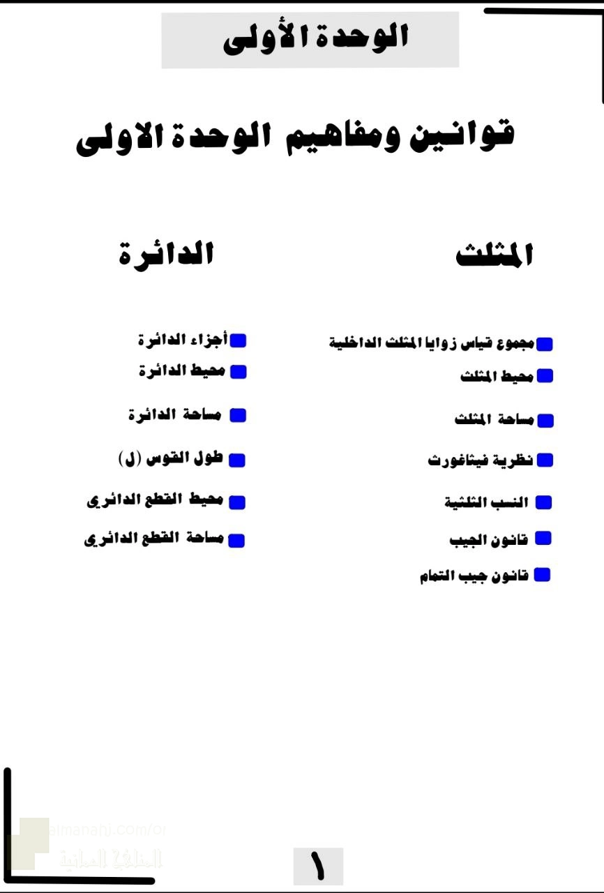 5. الصف الثاني عشر, رياضيات متقدمة, قوانين ومفاهيم الوحدة الأولى القياس الدائري