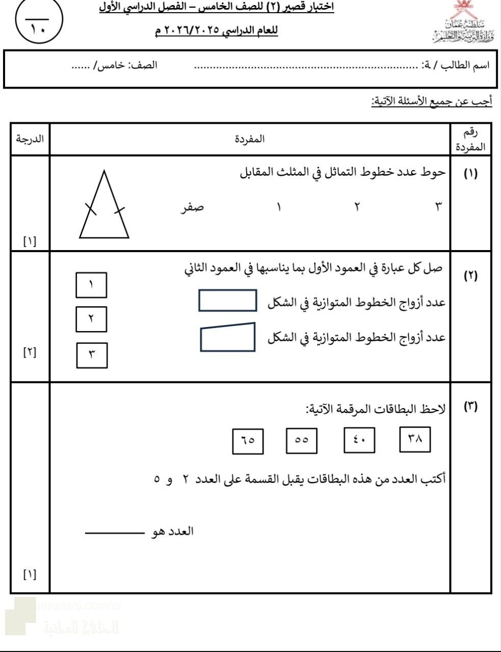 2. الصف الخامس, رياضيات, أسئلة اختبار قصير ثاني بدون حل