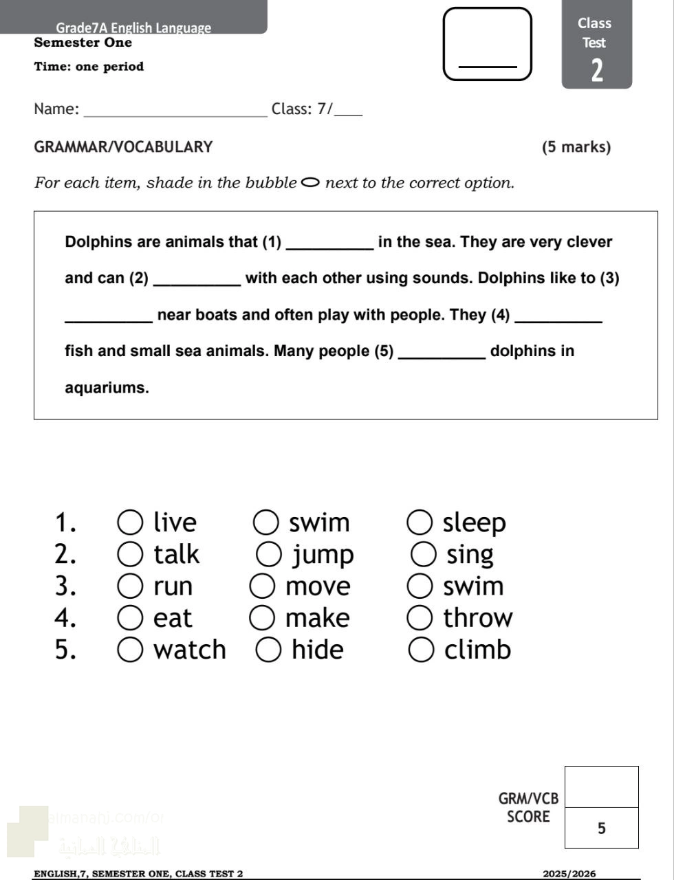 1. الصف السابع, لغة انجليزية, أسئلة اختبار قصير ثاني class test2