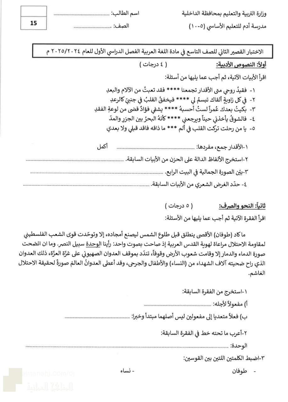 10. الصف التاسع, لغة عربية, اختبار قصير فتري ثاني بمحافظة الظاهرة