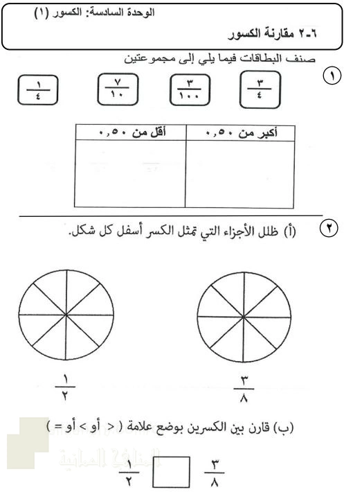6. الصف السابع, رياضيات, نشاط درس مقارنة الكسور من الوحدة السادسة الكسور