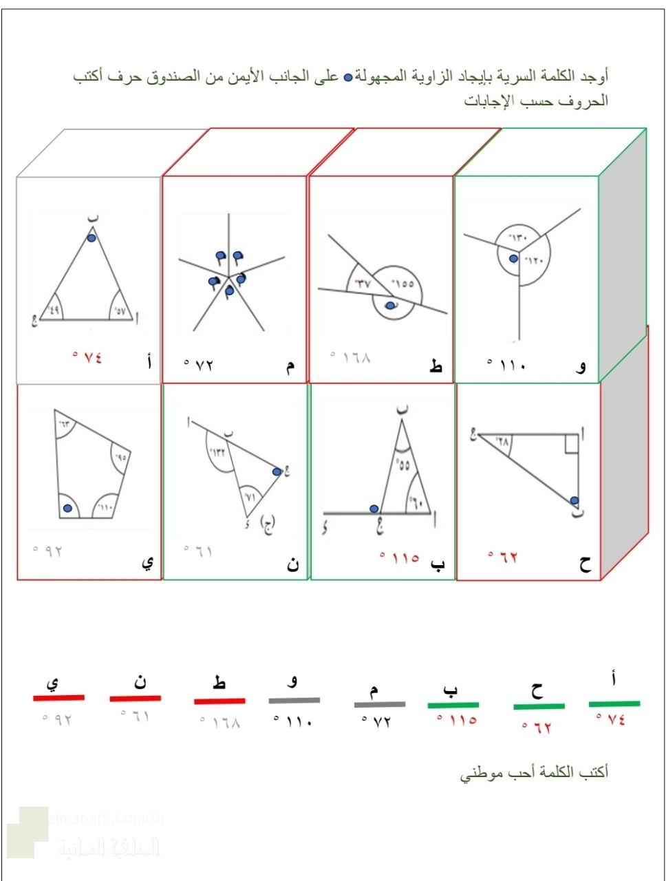 12. الصف السابع, رياضيات, تمارين على درس الزوايا وتقديرها