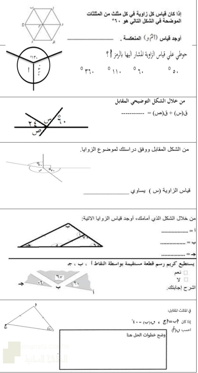 11. الصف السابع, رياضيات, تجميع أسئلة وحدة الزوايا