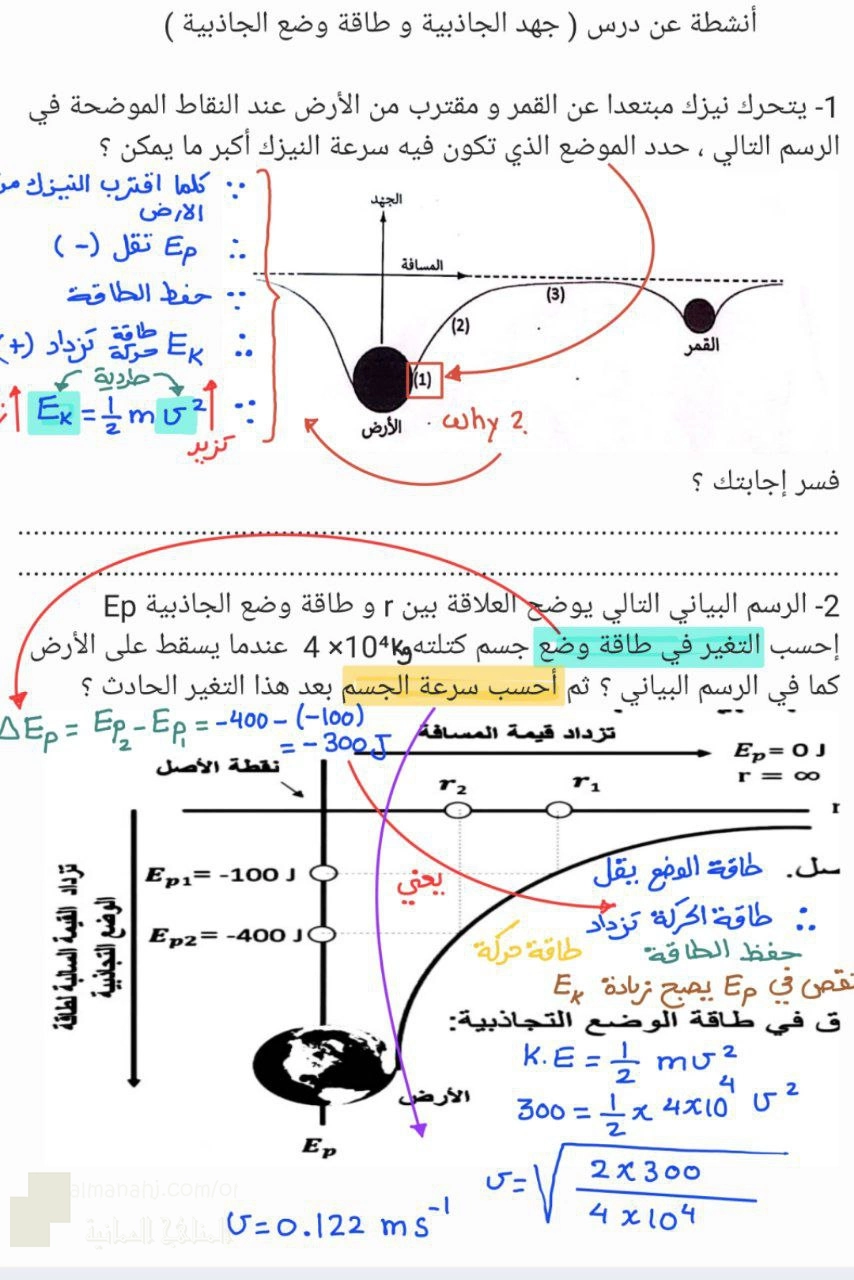 2. الصف الثاني عشر, فيزياء, أنشطة محلولة على درس جهد الجاذبية وطاقة وضع الجاذبية