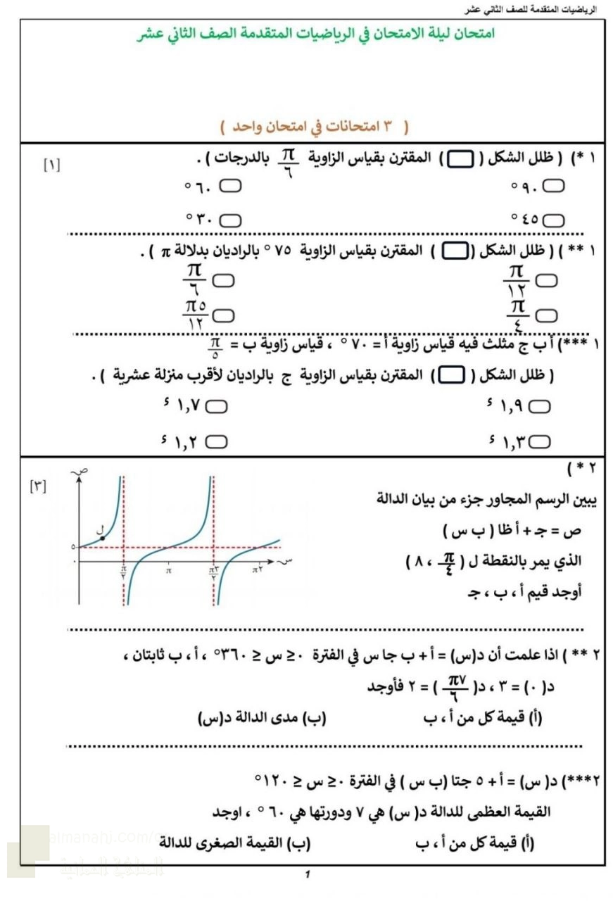 4. الصف الثاني عشر, رياضيات متقدمة, ثلاثة نماذج امتحانية للمراجعة قبل الامتحان النهائي