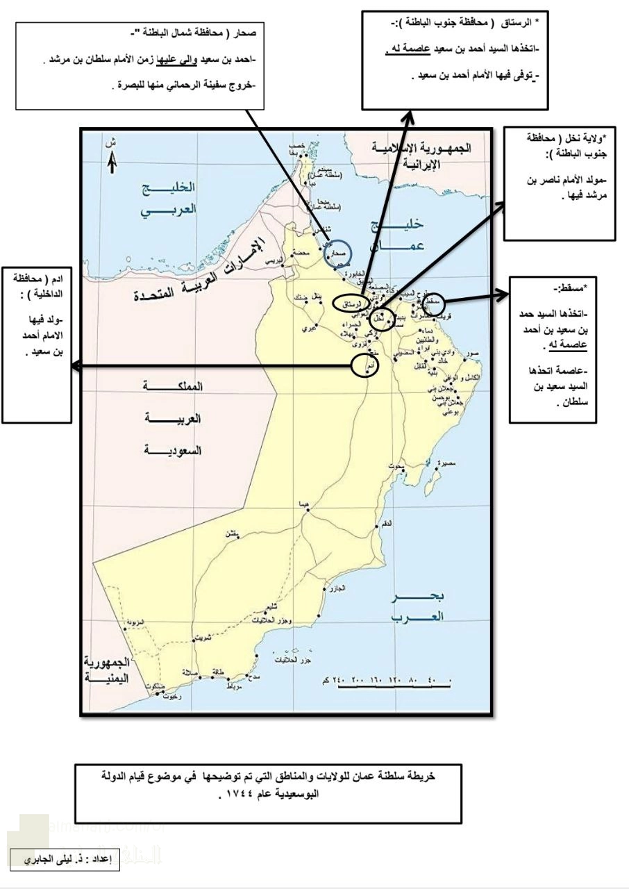 خريطة سلطنة عمان لقيام الدولة البوسعيدية, ليلى الجابري, الصف الثامن, اجتماعيات, الفصل الأول, 2025/2026 - المناهج العمانية