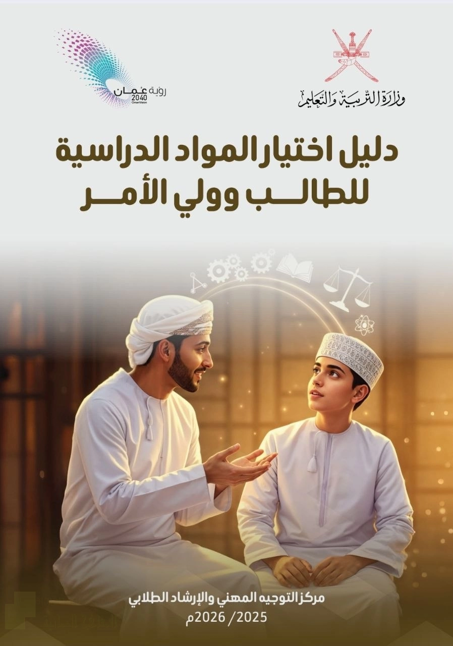 معلومات الملف: سعت وزارة التربية و التعليم في سلطنة عمان إلى توجيه الطلبة لاختيار موادهم الدراسية للصفين الحادي و الثاني عشر بما يتناسب مع ميولهم و احتياجات سوق العمل . وأصدر مركز التوجيه المهني دليلاً شاملاً يهدف إلى توعية الطلاب وأولياء أمورهم ودعمهم في هذه العملية. ويقدم هذا الدليل خطوات مقترحة ويعتمد على تفعيل القنوات الإعلامية و المطبوعات لتقديم المعلومات اللازمة.