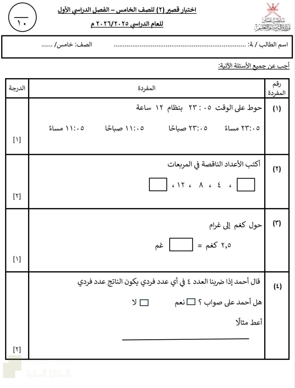 4. الصف الخامس, رياضيات, أسئلة اختبار قصير ثاني نموذج أول بدون حل