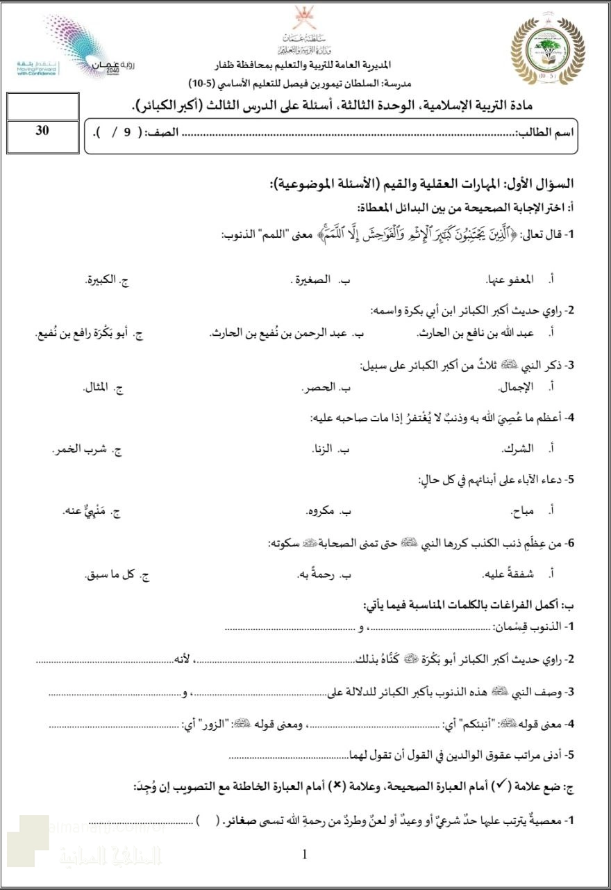 3. الصف التاسع, تربية اسلامية, اختبار قصير ثاني لمادة ديني منهجي بمحافظة جنوب الشرقية