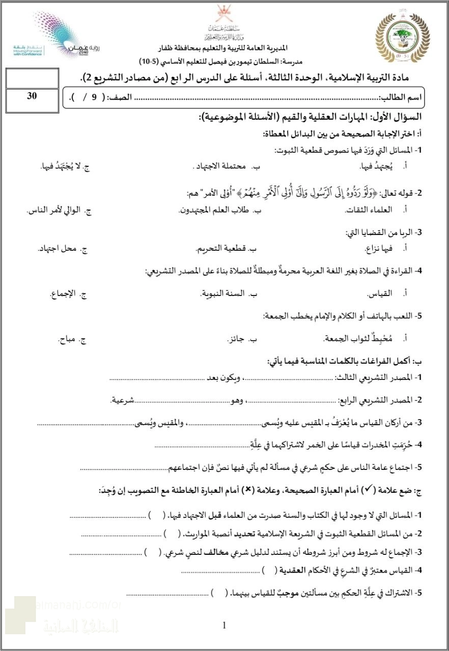9. الصف التاسع, تربية اسلامية, أسئلة اختبار على الدرس الرابع (من مصادر التشريع 2) من الوحدة الثالثة
