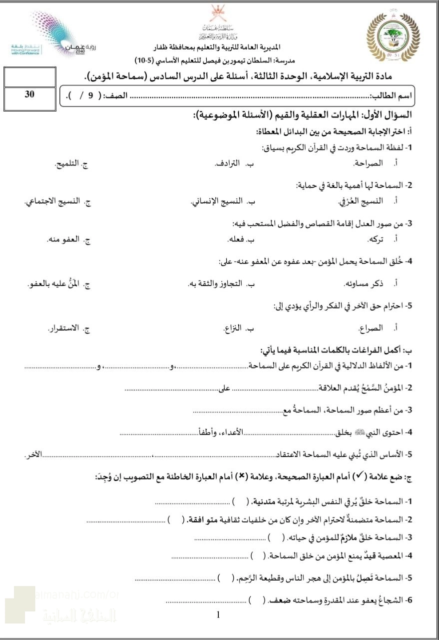 7. الصف التاسع, تربية اسلامية, أسئلة اختبار على الدرس السادس (سماحة المؤمن) من الوحدة الثالثة