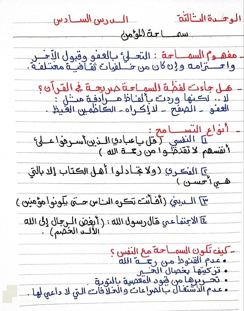 5. تربية اسلامية, الفصل الأول, 2025/2026, ملخص ثاني بخط اليد للدرس السادس سماحة المؤمن من الوحدة الثالثة