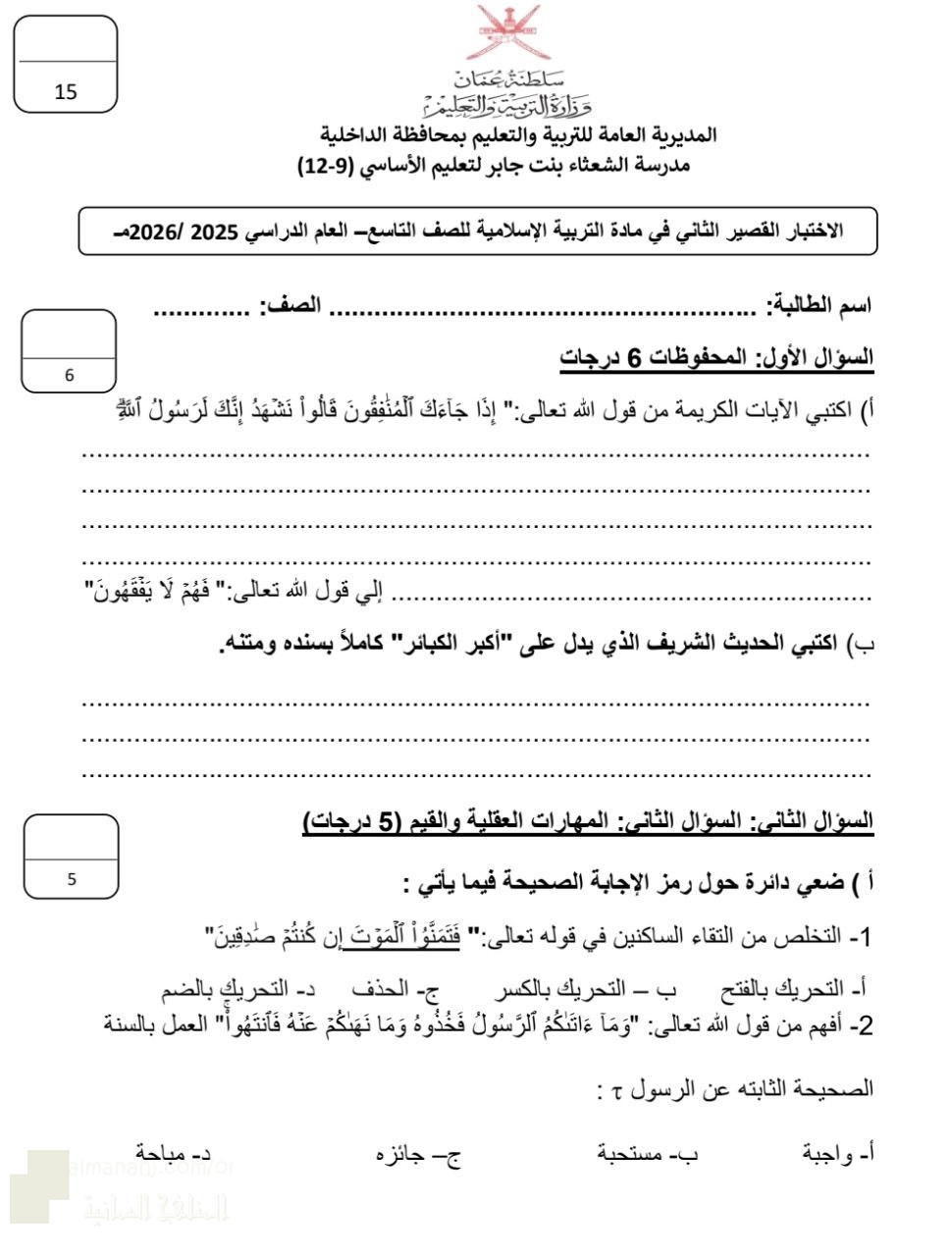 2. الصف التاسع, تربية اسلامية, اختبار قصير ثاني لمادة ديني حياتي بمحافظة الداخلية