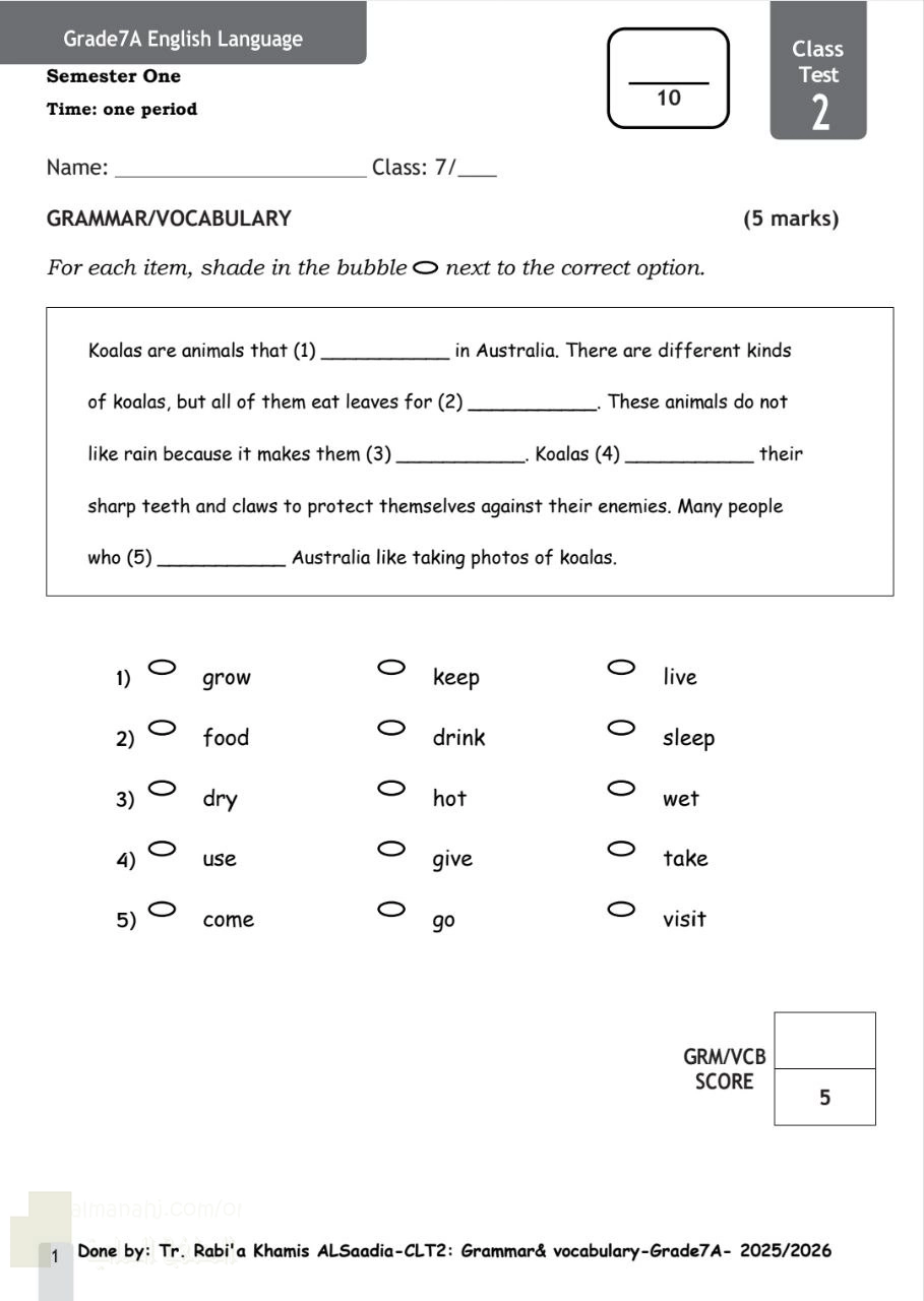 4. الصف السابع, لغة انجليزية, أسئلة اختبار قصير ثاني Class test2 نموذج ثاني