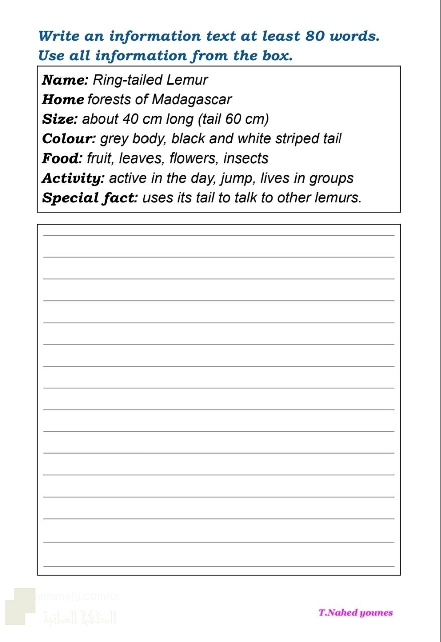 | نماذج وأنشطة كتابة نصوص وصفية ومعلوماتية عن الحيوانات مع نماذج الإجابات - إعداد: Nahed younes | ||