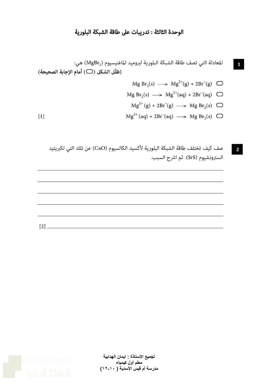 2. كيمياء, الفصل الأول, 2025/2026, تدريبات على الوحدة الثالثة طاقة الشبكة البلورية مع نموذج الإجابة