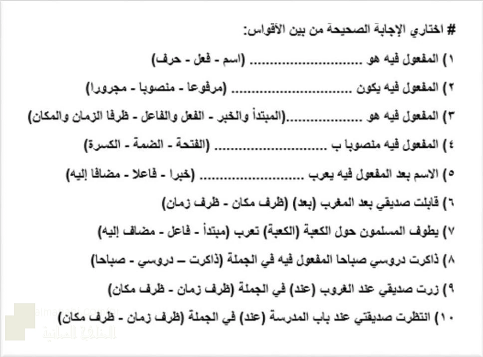 2. الصف التاسع, لغة عربية, ورقة عمل على درس المفعول فيه