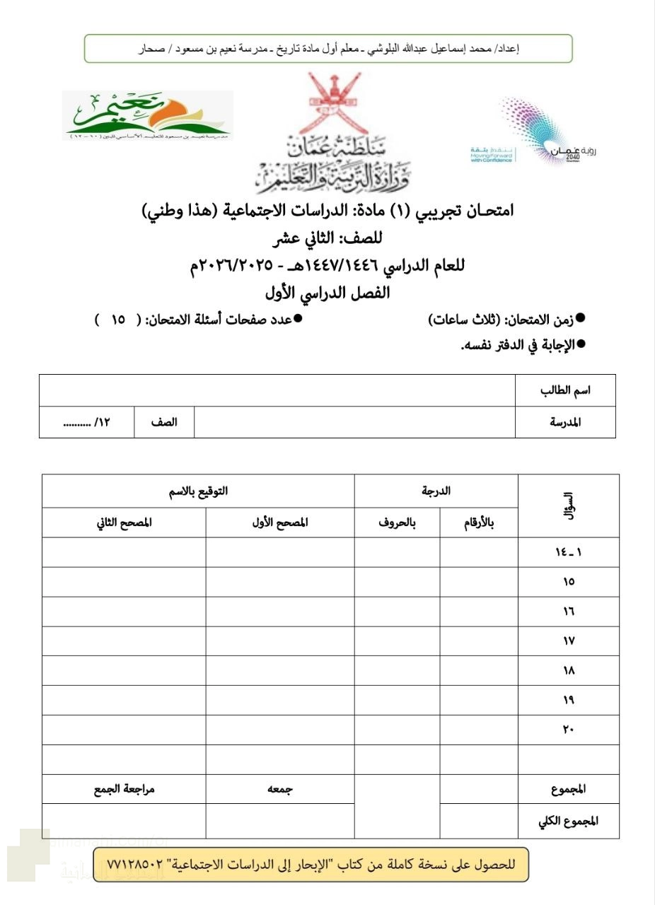 1. الصف الثاني عشر, اجتماعيات, امتحان تجريبي أول مع نموذج الإجابة من سلسلة الإبحار