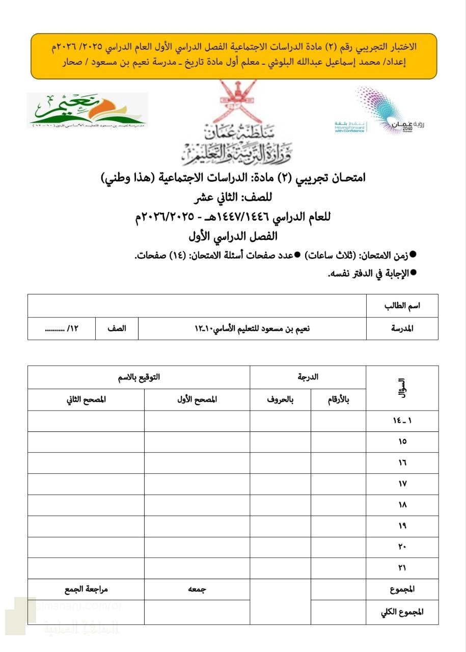 5. الصف الثاني عشر, اجتماعيات, امتحان تجريبي أول مع نموذج الإجابة من سلسلة الإبحار