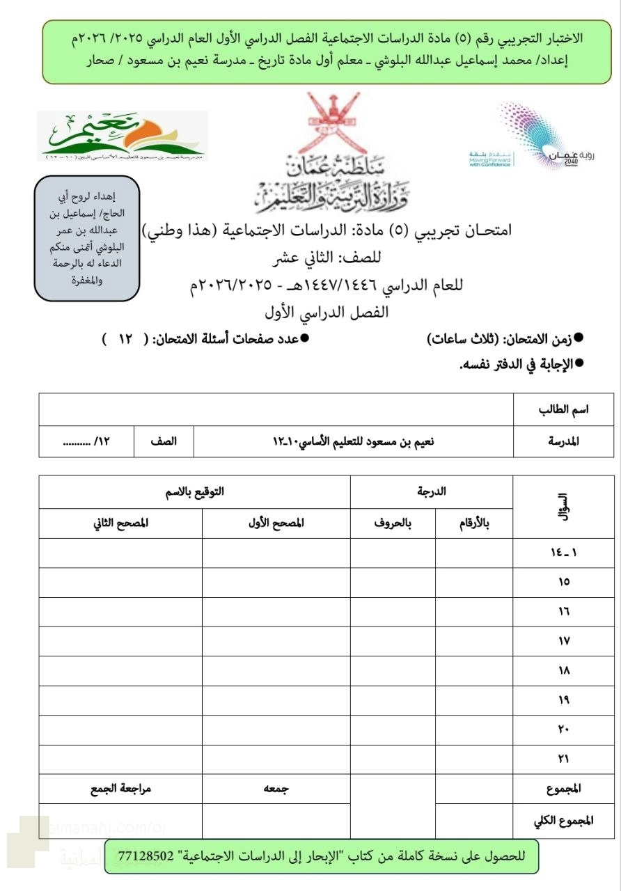 5. الصف الثاني عشر, اجتماعيات, امتحان تجريبي أول مع نموذج الإجابة من سلسلة الإبحار