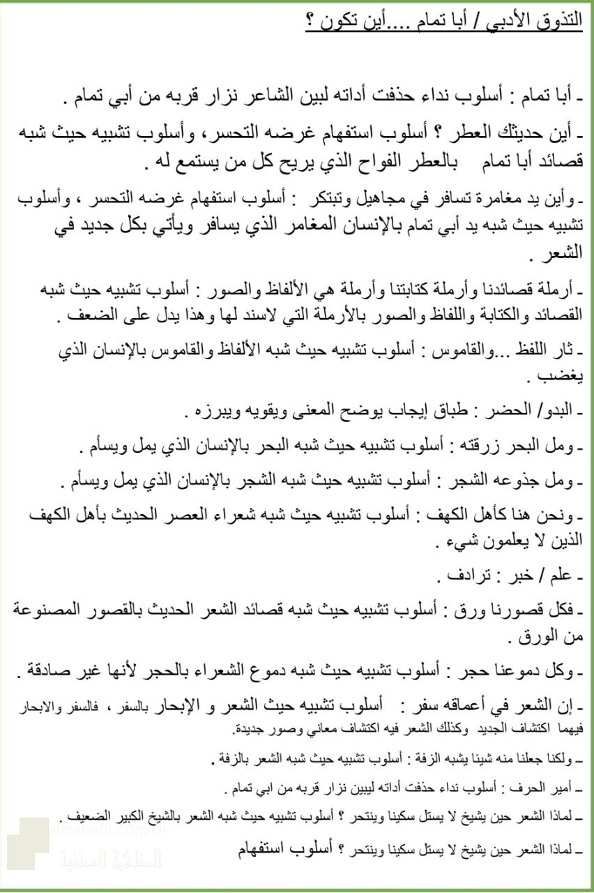 معلومات الملف: أعزائي الطلبة نقدم لكم ملف يتضمن ملخص التذوق الأدبي أبا تمام أين تكون ؟ من مادة اللغة العربية للصف التاسع الفصل الدراسي الأول