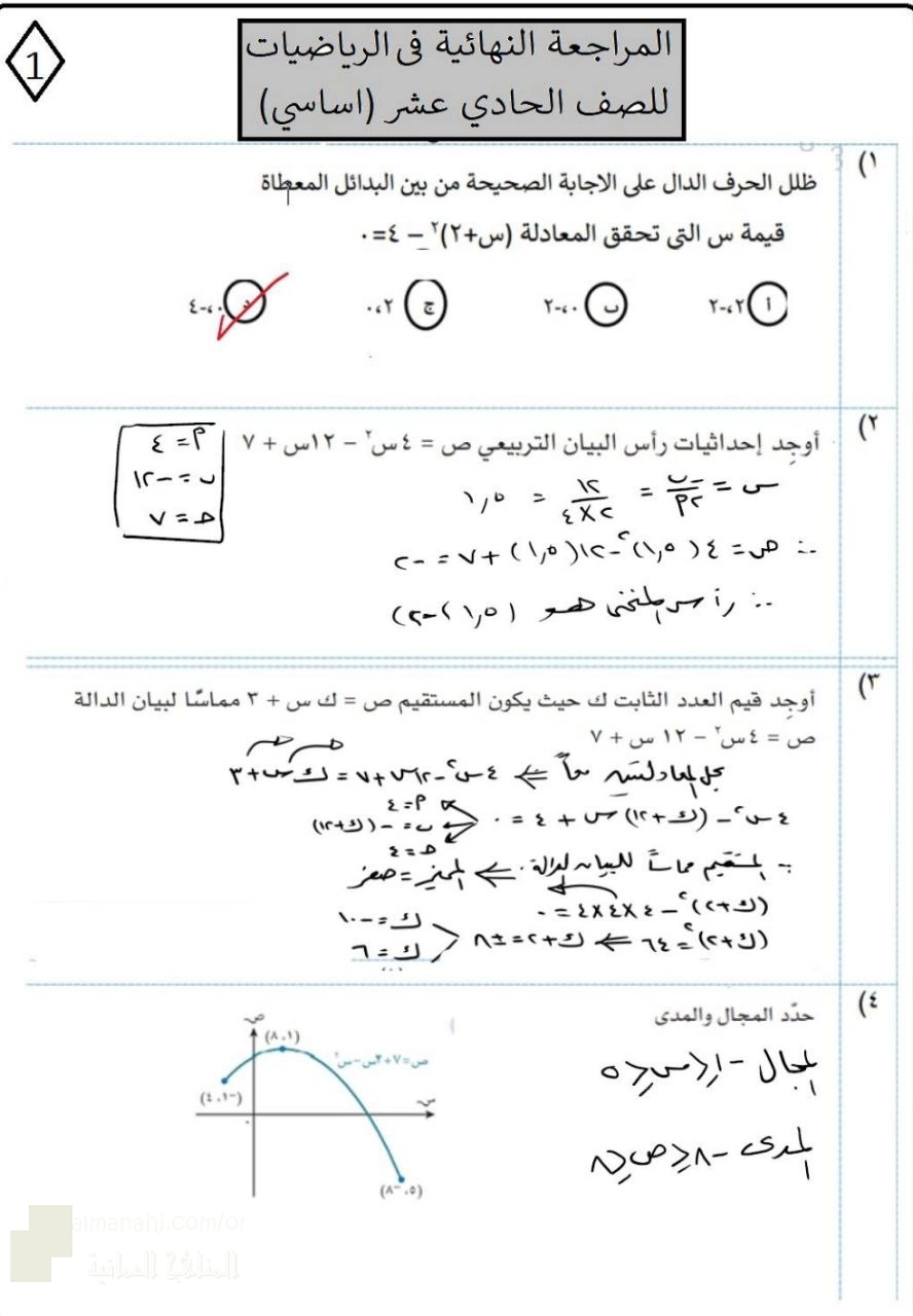 أسئلة وإجابات المراجعة النهائية للمادة, الصف الحادي عشر, رياضيات أساسية, الفصل الأول, 2025/2026 - المناهج العمانية