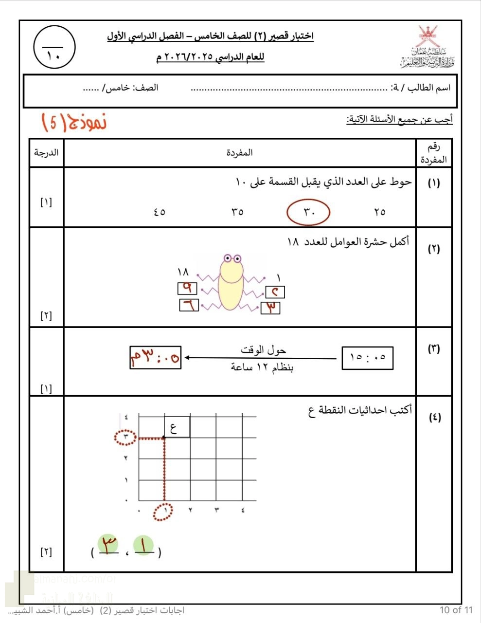2. الصف الخامس, رياضيات, إجابات أسئلة الاختبار القصير الثاني نموذج خامس