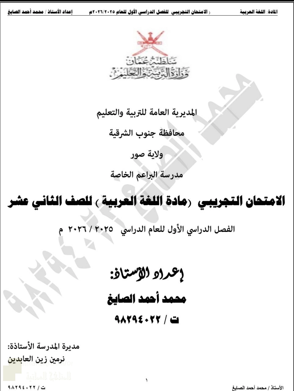 7. الصف الثاني عشر, لغة عربية, الامتحان التجريبي في ولاية صور