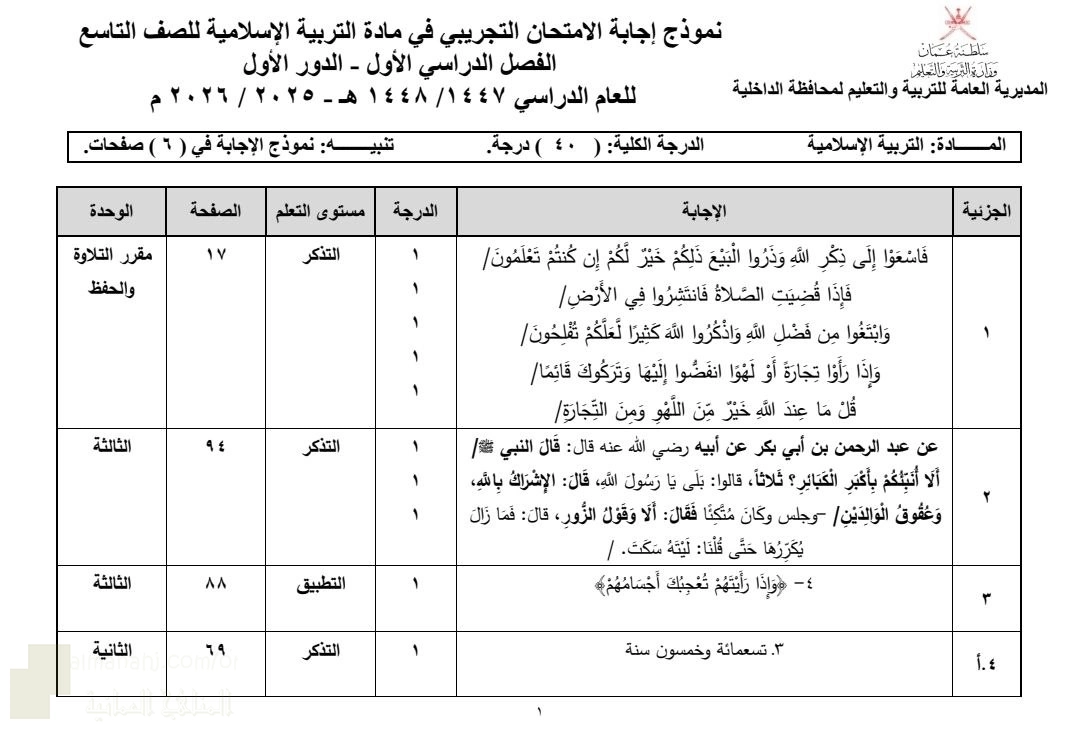2. الصف التاسع, تربية اسلامية, أسئلة الامتحان التجريبي النهائي في محافظة الداخلية
