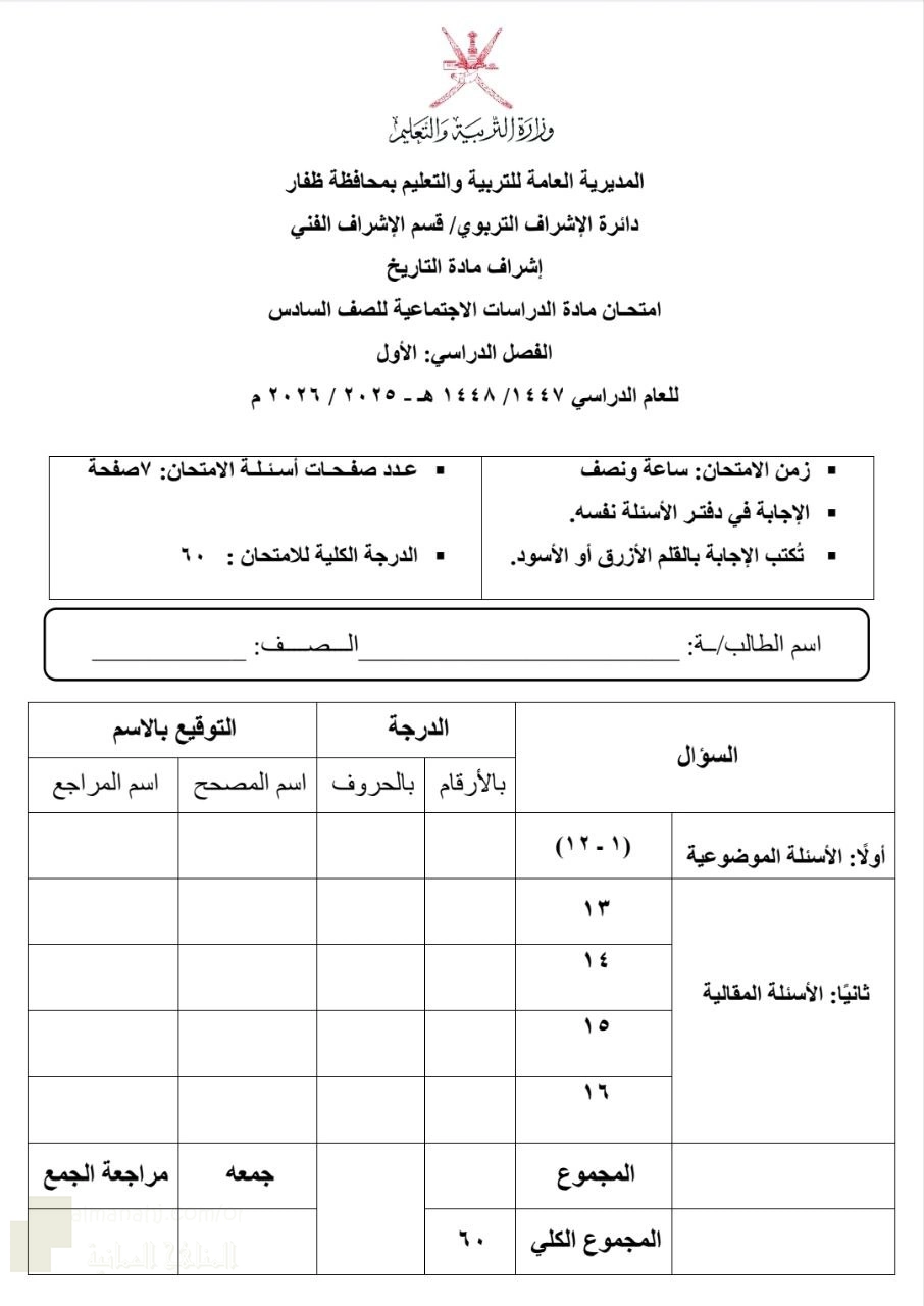 8. الصف السادس, اجتماعيات, امتحان تجريبي نهائي مرفق بنموذج الإجابة في محافظة ظفار