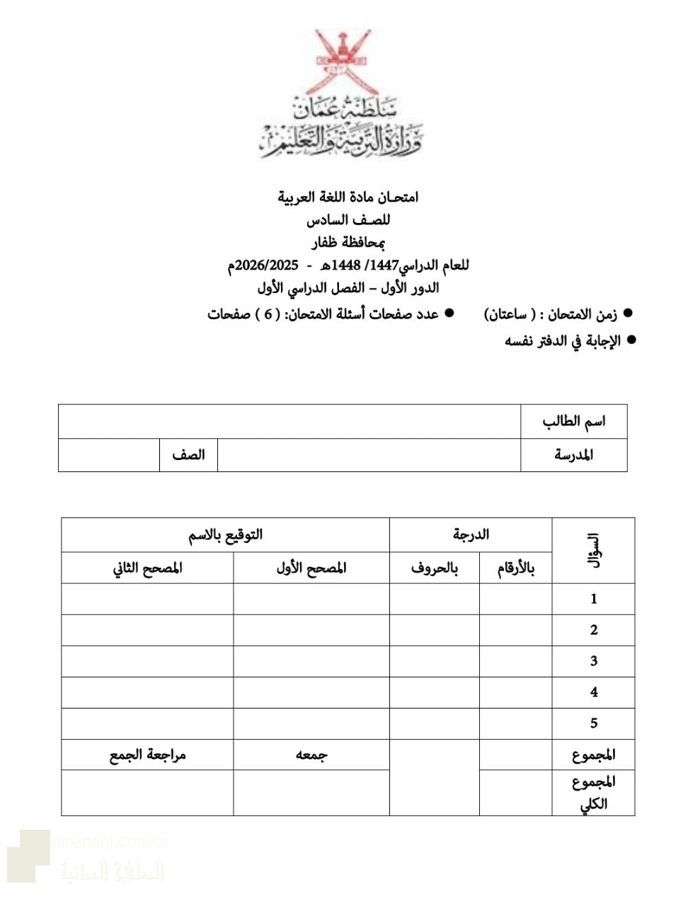 6. لغة عربية, الفصل الأول, 2025/2026, نموذج إجابة الامتحان التجريبي لمحافظة ظفار