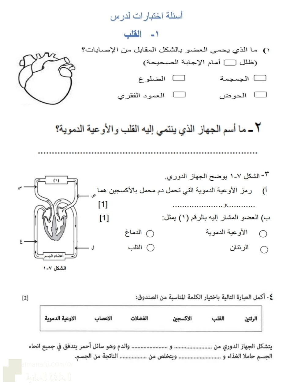 4. الصف السادس, علوم, أسئلة اختبارات لدرس القلب من تميز أكاديمي
