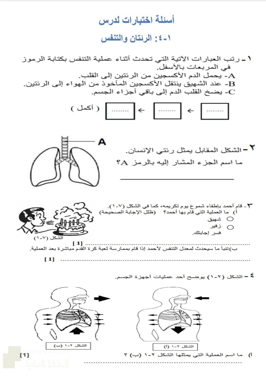 4. الصف السادس, علوم, أسئلة اختبارات لدرس الرئتان والتنفس من تميز أكاديمي