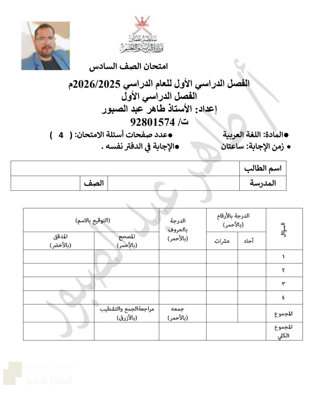 4. الصف السادس, لغة انجليزية, امتحان تجريبي نهاية الفصل في محافظة مسندم
