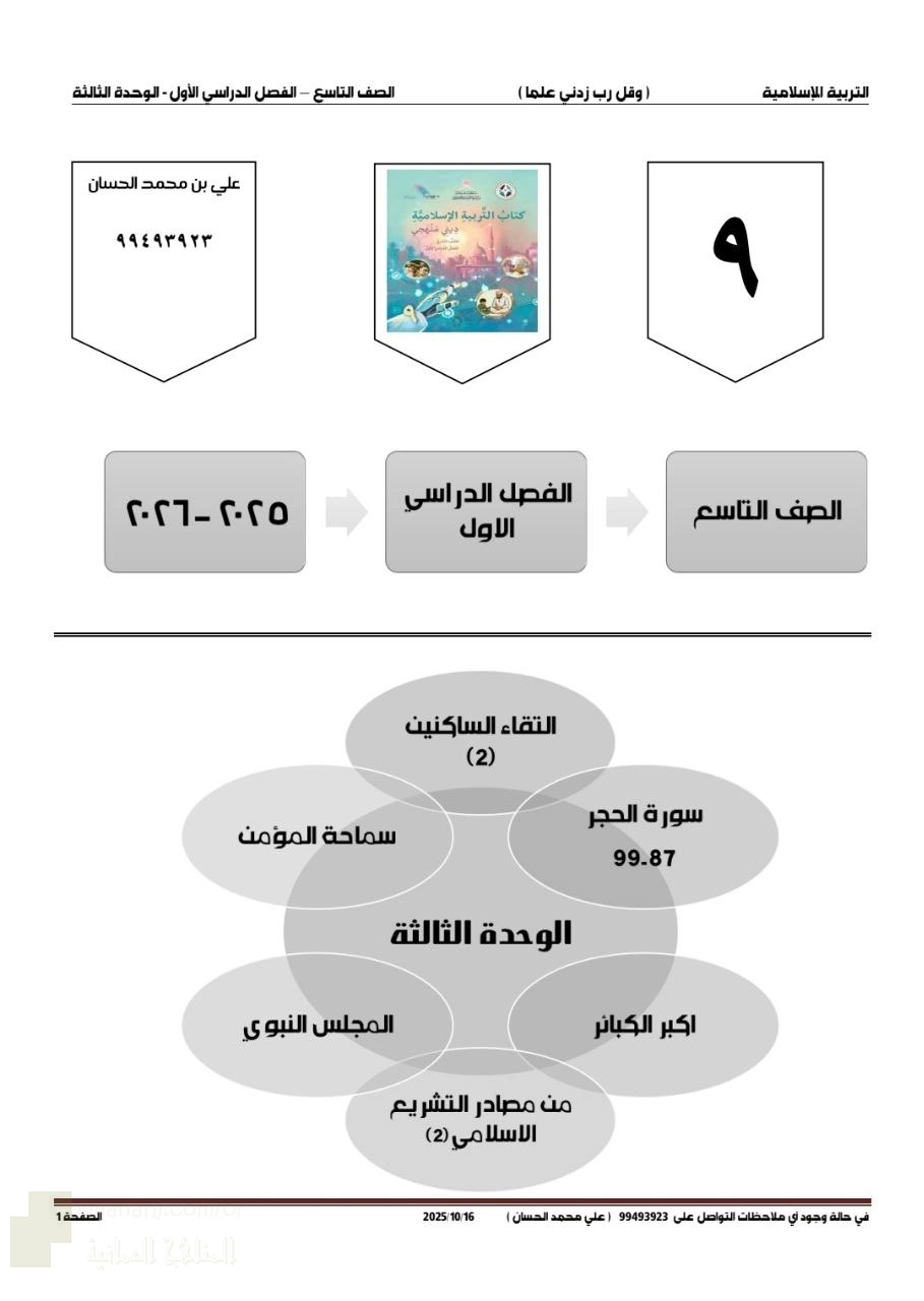 7. الصف التاسع, تربية اسلامية, مذكرة إثرائية سؤال وجواب في الوحدة الثالثة من مادة ديني منهجي