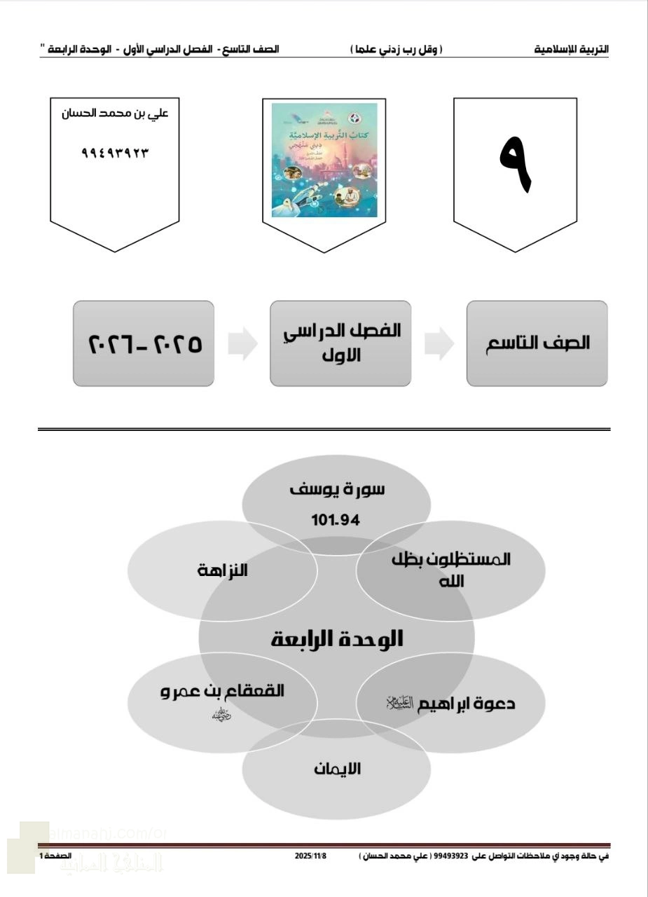 6. الصف التاسع, تربية اسلامية, مذكرة إثرائية سؤال وجواب في الوحدة الرابعة من مادة ديني منهجي