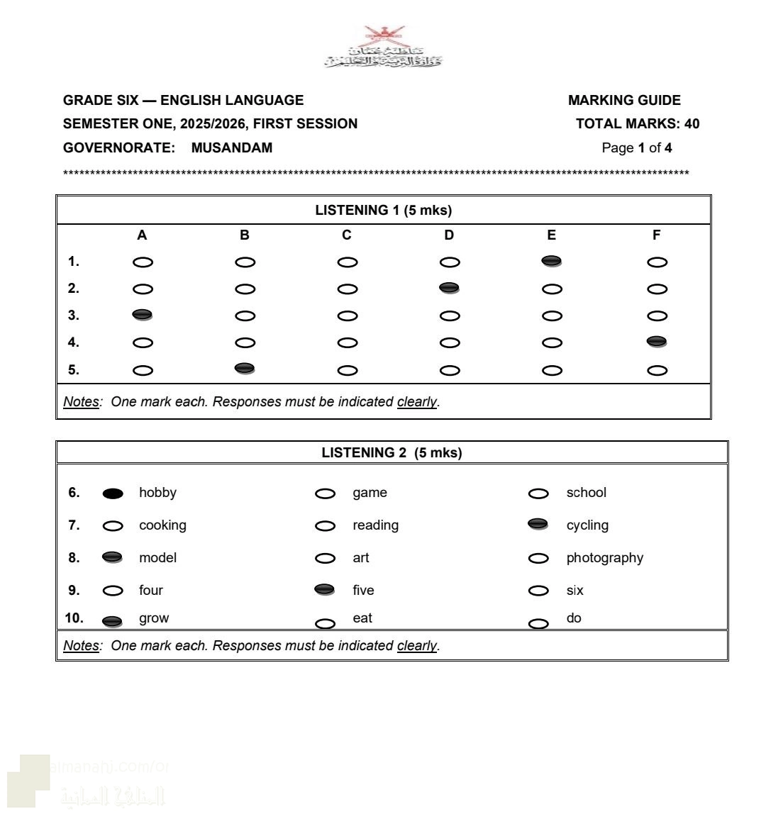 5. الصف السادس, لغة انجليزية, امتحان تجريبي نهاية الفصل في محافظة مسندم