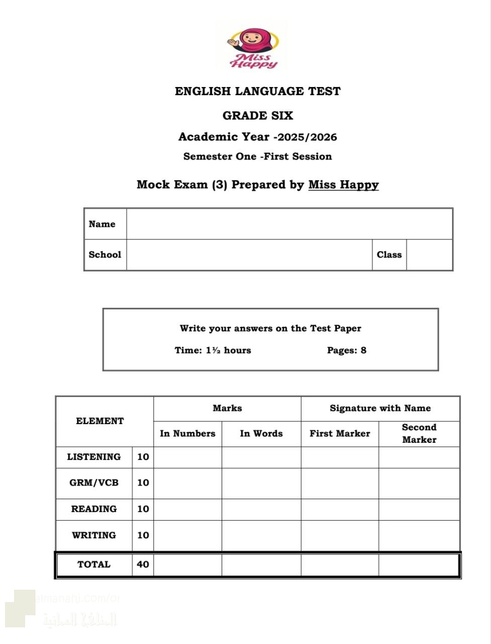 1. الصف السادس, لغة انجليزية, أسئلة الامتحان التجريبي (1)