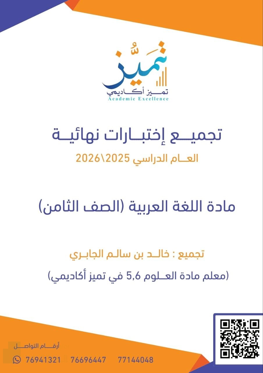 تجميع أسئلة وإجابات امتحانات العام الماضي من تميز أكاديمي, خالد بن سالم الجابري, الصف الثامن, لغة عربية, الفصل الأول, 2025/2026 - المناهج العمانية