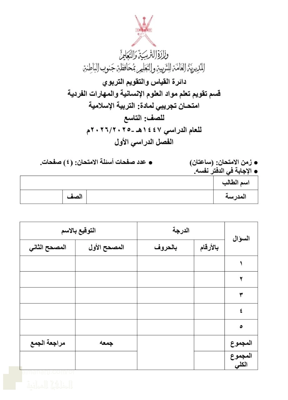 11. الصف التاسع, لغة عربية, امتحان تجريبي لمادة ديني منهجي بمحافظة جنوب الباطنة