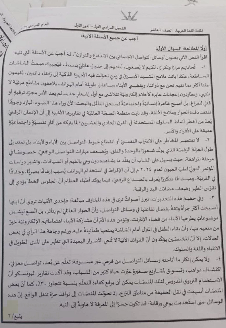 9. الصف العاشر, لغة عربية, أسئلة الامتحان النهائي الرسمي الدور الأول الفترة الصباحية حديث