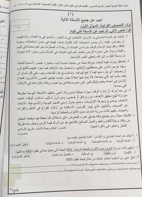 10. الصف التاسع, لغة عربية, نموذج إجابة الامتحان النهائي الرسمي الدور الأول الفترة الصباحية (حديث)