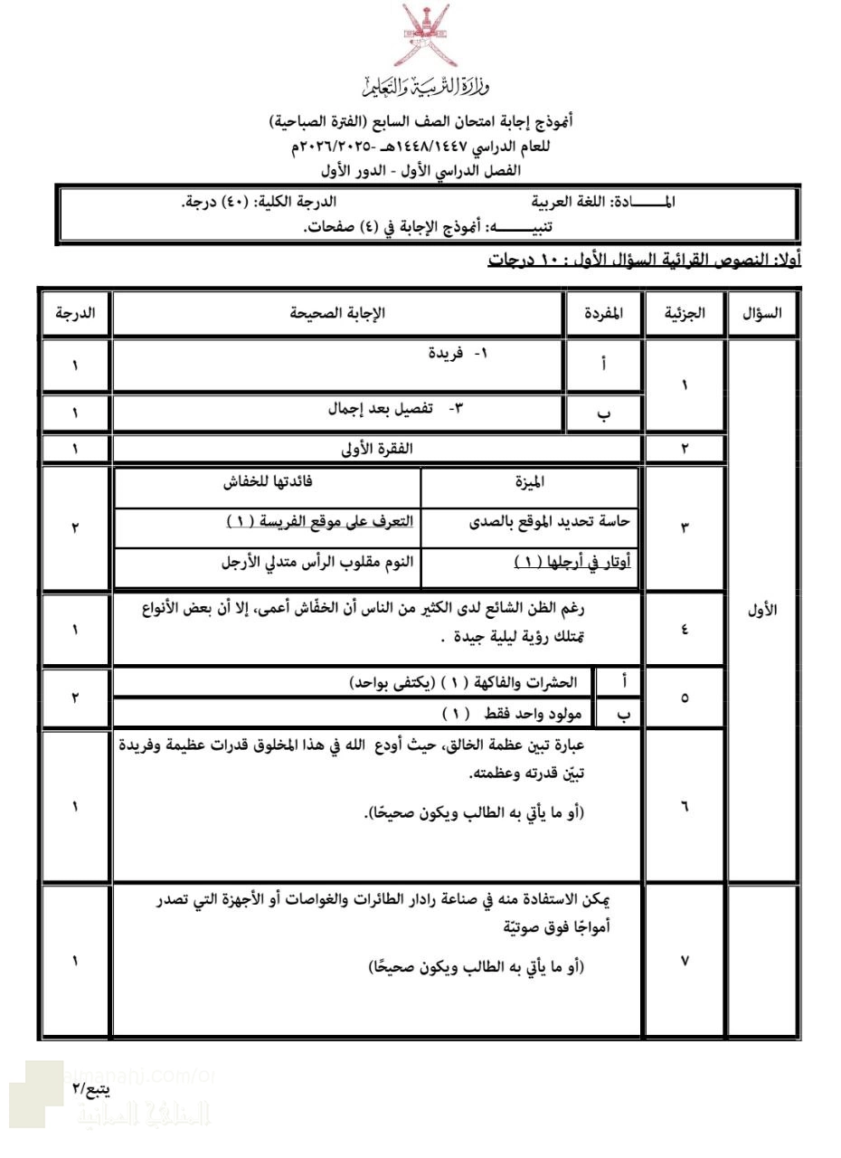 نموذج إجابة الامتحان النهائي الرسمي الدور الأول الفترة الصباحية جديد, الصف السابع, لغة عربية, الفصل الأول, 2025/2026 - المناهج العمانية