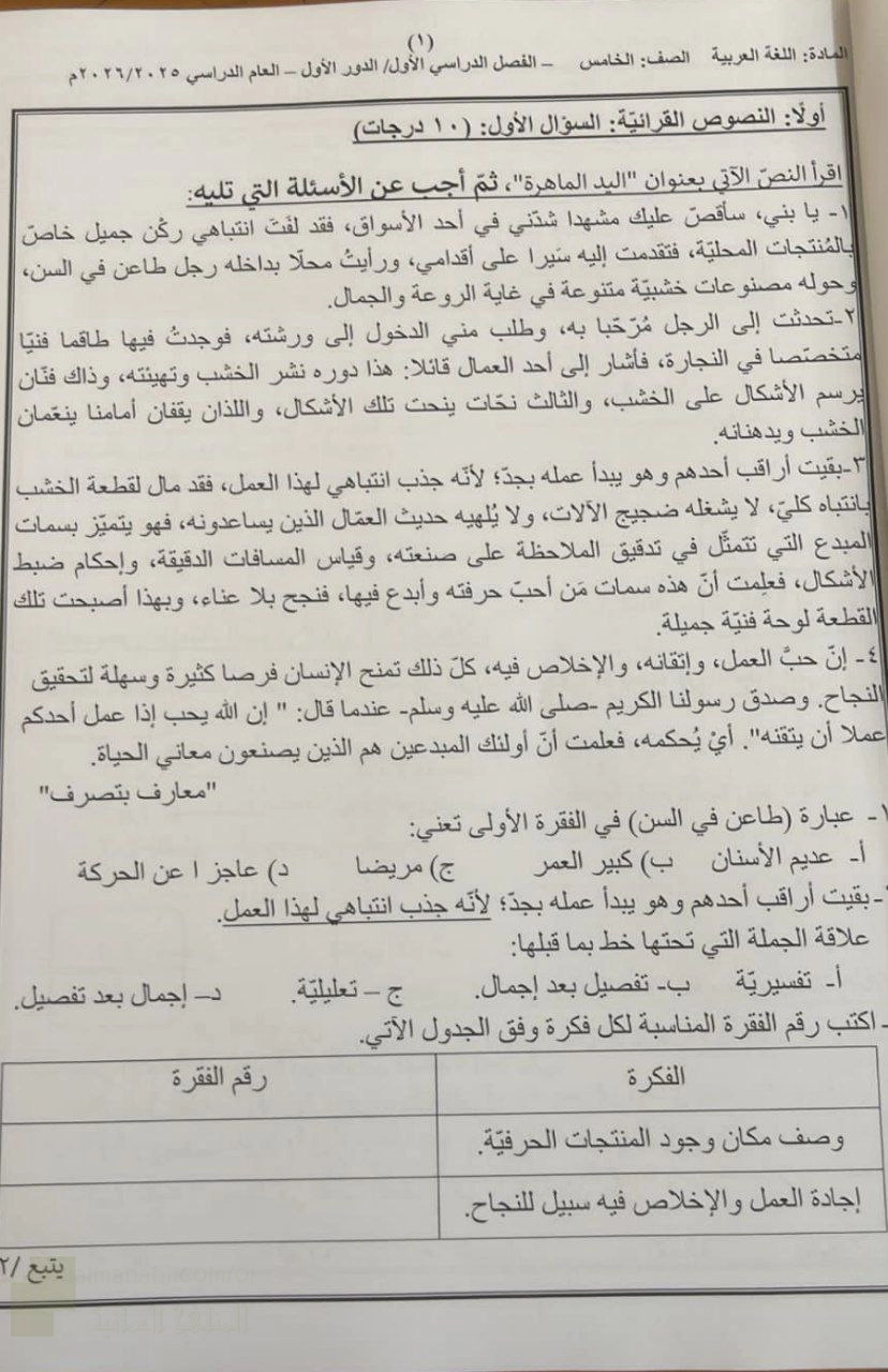 4. الصف الخامس, لغة عربية, أسئلة امتحان نهائي رسمي الدور الأول الفترة الصباحية