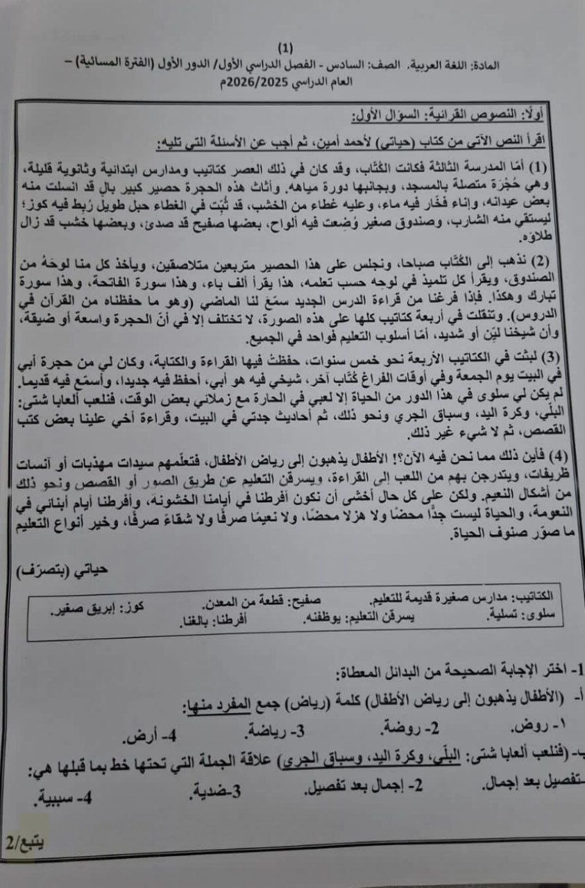 6. الصف الثامن, لغة عربية, أسئلة الامتحان النهائي الدور الأول الفترة الصباحية