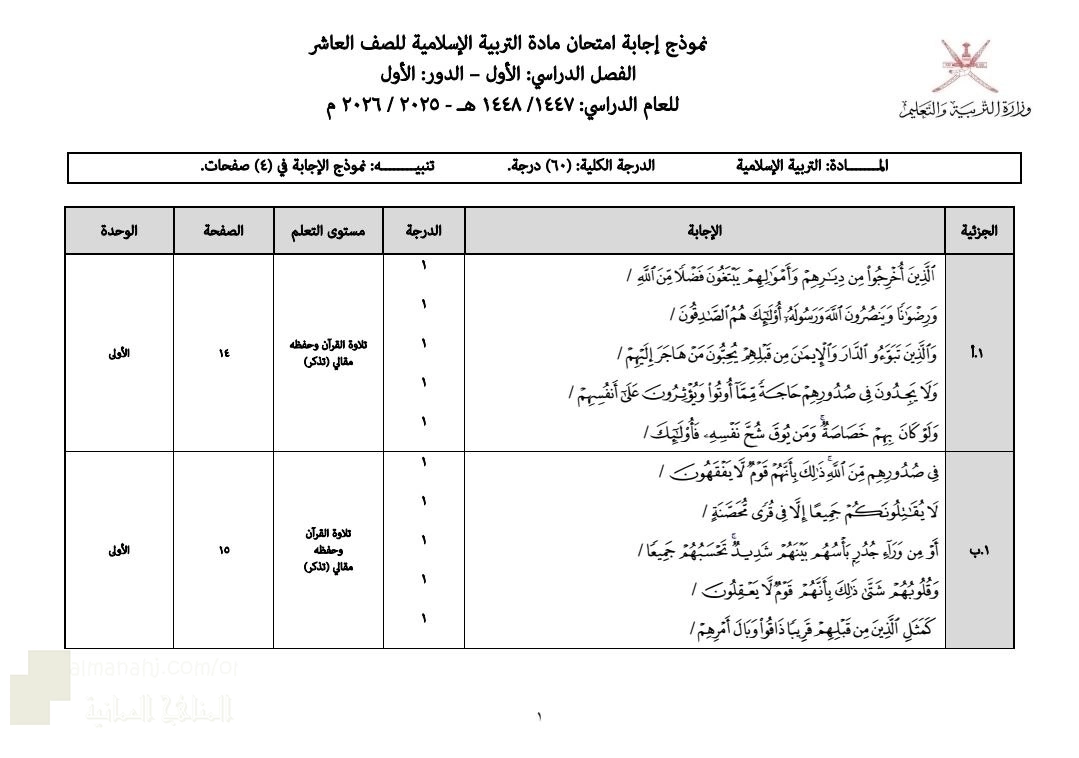 13. الصف التاسع, تربية اسلامية, الامتحان التجريبي النهائي بمحافظة الداخلية
