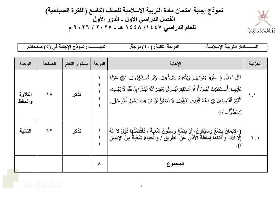 نموذج إجابة امتحان مادة التربية الإسلامية الدور الأول الفترة الصباحية, الصف التاسع, تربية اسلامية, الفصل الأول, 2025/2026 - المناهج العمانية