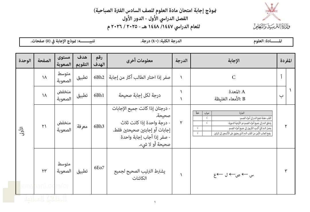 نموذج إجابة امتحان مادة العلوم الدور الأول الفترة الصباحية, الصف السادس, علوم, الفصل الأول, 2025/2026 - المناهج العمانية