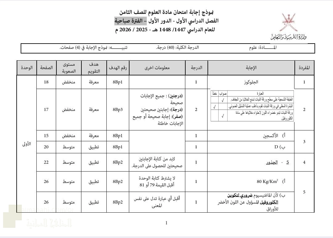 نموذج إجابة الامتحان الرسمي النهائي الدور الأول الفترة الصباحية, الصف الثامن, علوم, الفصل الأول, 2025/2026 - المناهج العمانية