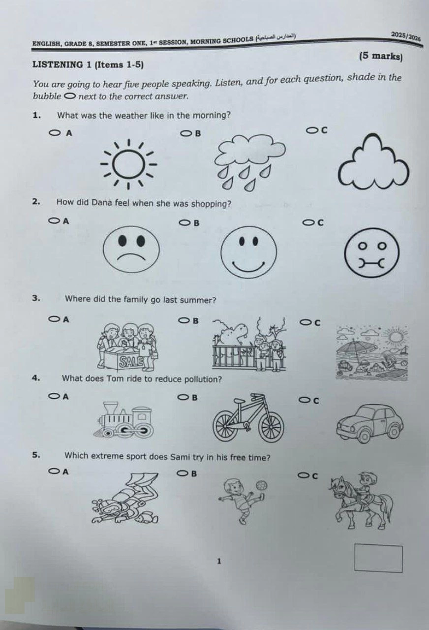 6. الصف الثامن, لغة انجليزية, امتحان نهائي رسمي الدور الأول الفترة الصباحية
